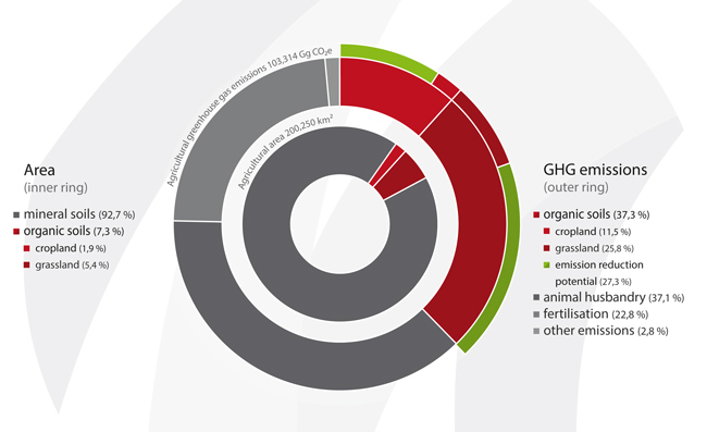 Conventional land use of peatlands requires drainage, which causes problems such as high greenhouse gas emissions, nutrient efflux, loss of biodiversity, soil degradation, and increasingly impaired land use options. In Germany, more than 30 % of all greenhouse gas emissions caused by the agricultural sector originate from degraded peatlands, which make up only a minor fraction of agricultural land (s. fig.).