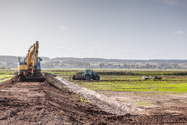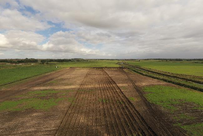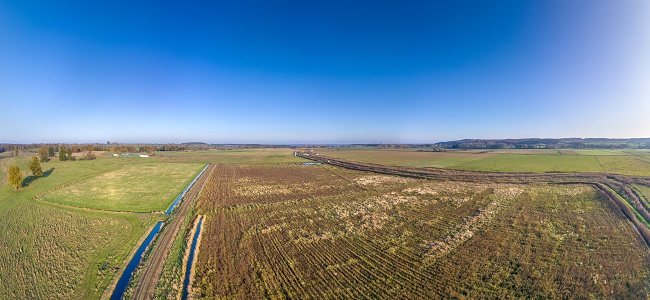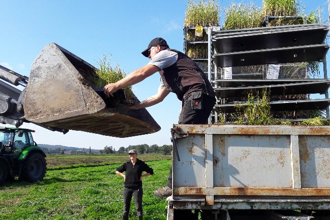 Eine auf Wasserpflanzen spezialisierte Gärtnerei hat je 25.000 Setzlinge von Typha latifolia und Typha angustifolia aufgezogen. Diese wurden Mitte September 2019 geliefert und mit zwei traktorgezogenen Pflanzmaschinen aus der Forstwirtschaft gepflanzt. Die zwei Typha-Arten wurden jeweils in zwei Dichten gepflanzt: 1 Pflanze je m² bzw. 0,5 Pflanzen je m² (Pflanzschema 2 m x 0,5 m bzw. 2 m x 1 m). Im Juni 2020 erfolgte auf der flach überstauten Fläche eine Saat von Pellets (Typha-Samen + Ton) per Hand und per Drohne.