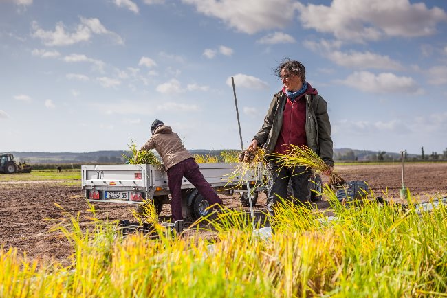 Die große Praxisfläche ermöglicht die Erprobung von Spezialtechnik für nasse Moore bei einer Ernte von Rohrkolben-Biomasse für unterschiedliche Verwertungswege. Die erste maschinelle Test-Ernte fand im Dezember 2021 in einem einstufigen Verfahren durch Raupentechnik mit aufgesatteltem Bunker statt. Im Januar 2023 erfolgten Mahd und Beräumung der gesamten Fläche in einem zweistufigen Verfahren mit kettenbasierter Mähraupe und Ladewagen. Zusätzlich wurden im Herbst 2022 und 2023 manuell Fruchtstände zur Weiterverarbeitung geerntet. Rohrkolben-Biomasse kann für ein breites Spektrum an Verwertungsmöglichkeiten eingesetzt werden, z. B. für hochwertige Bau- und Dämmstoffe, als Daunenersatz in der Textilindustrie oder als Rohstoff für Substrate im Gartenbau.