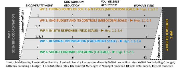 PRINCESS is organized around seven work packages (WPs), of which WP2-WP6 are designed to cover all relevant scales (see below). Each WP considers biodiversity values, GHG emission reduction, N loads and the three land use options for rewetted peatlands but has a different focus within or between the indicators. With change in scale, also the proxy used for the indicator can change, e.g. for the indicator ‘biodiversity values’ from microbial diversity (WP2-4) and vegetation diversity (WP3-4) to key faunal diversity (WP4) and ecosystem diversity (WP5-6), and for the indicator ‘GHG emission reduction’ from measured single gas fluxes (WP2-4) to site-specific emission factors GEST (WP5) and IPCC default.